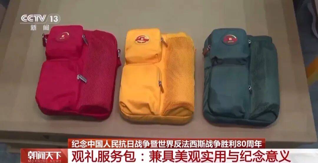记者 王胜东:在观礼人员服务包的存储仓库,这些服务包已经被装载完毕,静待发车。先来了解一下服务包的外部设计特点和使用功能。它上面有一个小口袋,可以装风油精和纸巾,下面还有一个小口袋,可以装背包袋,旁边的网兜,可以装水瓶或者水壶。它能够基本满足广场上观礼群众当天的保障需求,而这三个小口袋就构成了“80”字样,契合今年抗战胜利80周年的主题。服务包一共划分为三个颜色,分别是城墙红、丰饶金和橄榄绿,它们与广场上座椅的颜色是一一对应的,也就是说您在广场上处于不同的观礼位置,就会得到不同颜色的服务包。