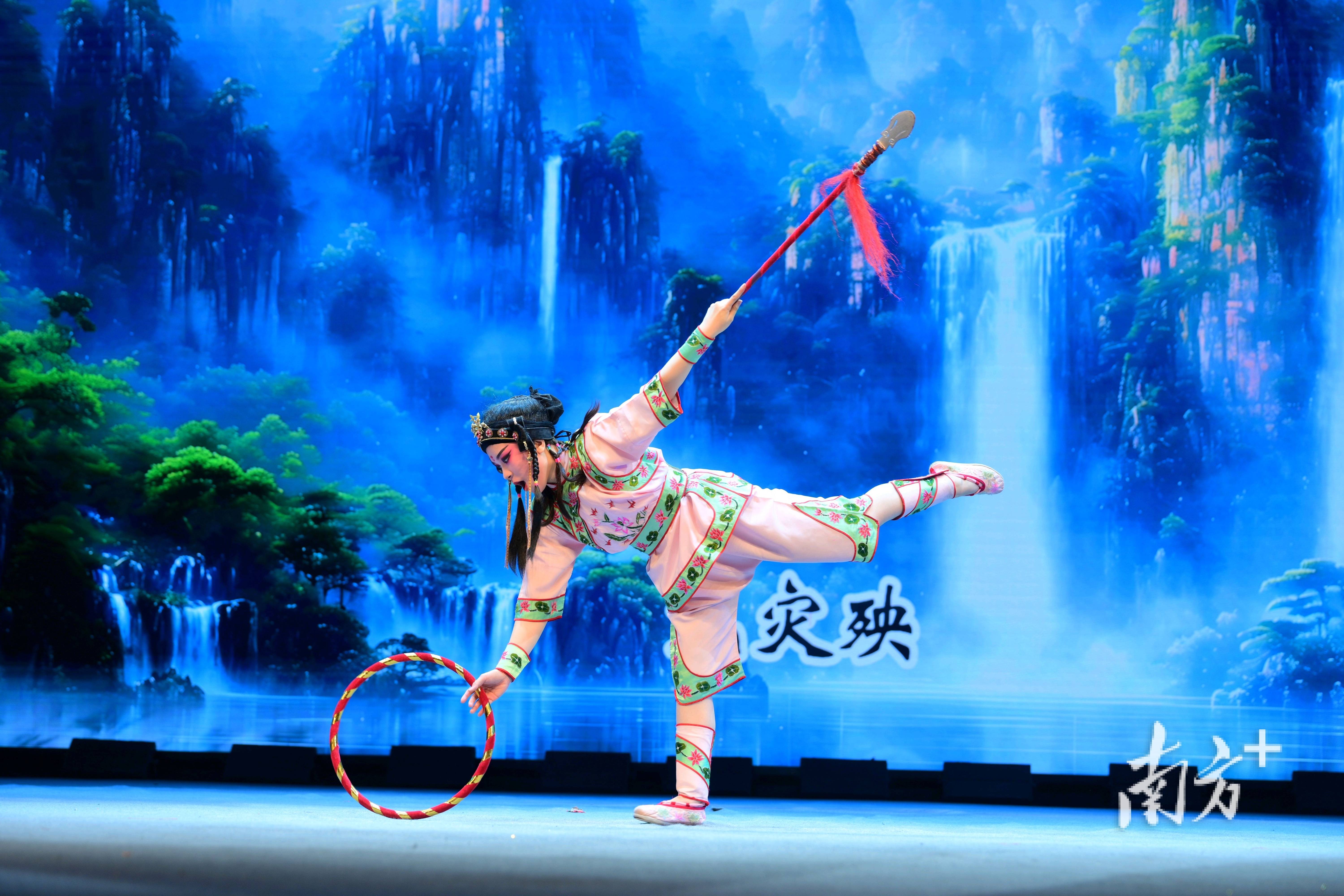 当晚演出首篇“瑞祥”融合南北技艺,呈现出一场跨越地域的文化对话。南沙区黄阁镇大井龙狮麒麟团献上一舞《麒麟贺双节》尽显祥瑞欢腾;佛山粤剧院改编神话故事带来《大话哪吒》,以儿童粤剧形式诠释“少年强则国强”的时代主题;“圳得弹”乐队以一曲原创作品《神兽组曲-朱雀》,充分展现黑龙江佳木斯市市级非遗代表性项目李氏三弦演奏技艺,为民乐注入神话色彩。