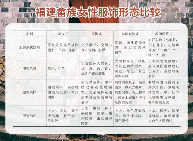 在福建,畲族女性服饰可以分为罗源式、福安式、霞浦东路式、霞浦西路式等,这些服饰既有共性又有个性,既一脉相承又各具特色。