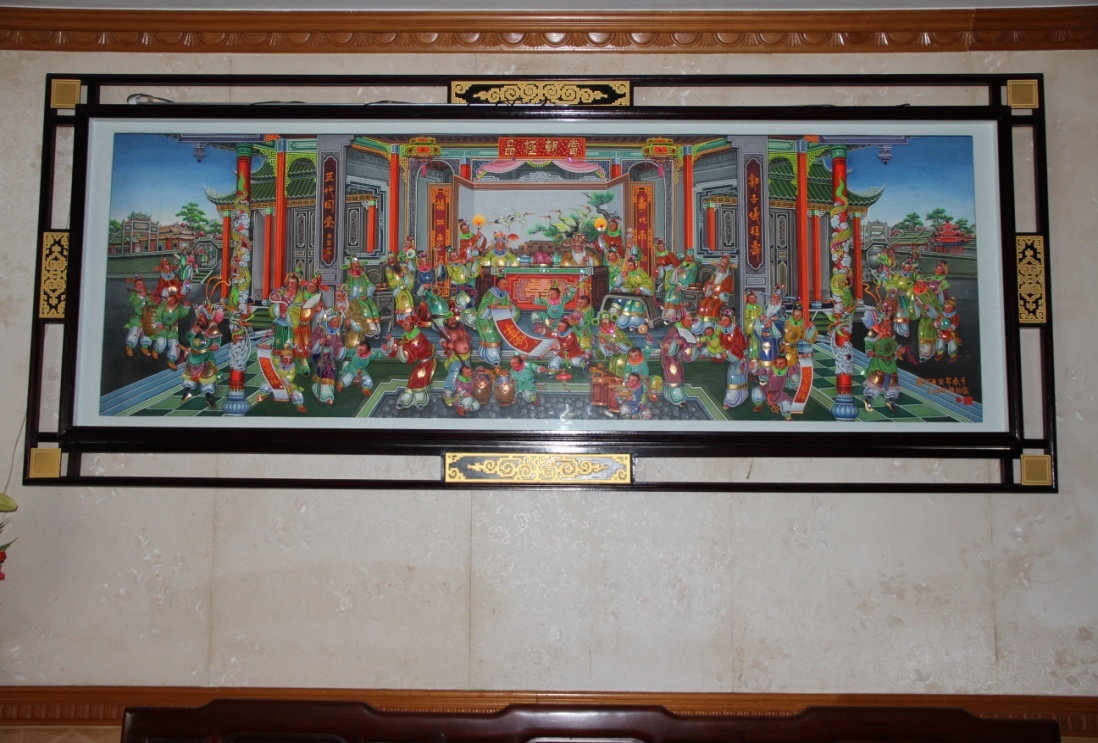 以往嵌瓷多内销,流通于普宁当地,尤其在改革开放后,农村兴起了一阵“建房子”风潮,嵌瓷画又重新在农村建筑中流行起来。彼时王昭武又开始到外面为厝场、庙宇、祠堂做嵌瓷画,屋顶多画花鸟,室内多画人物。
