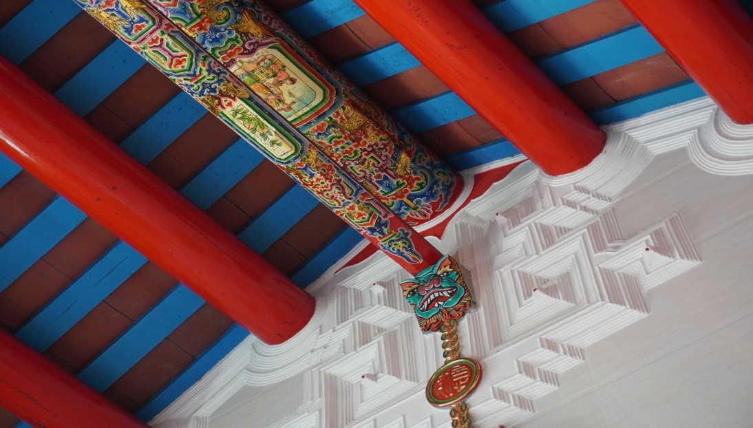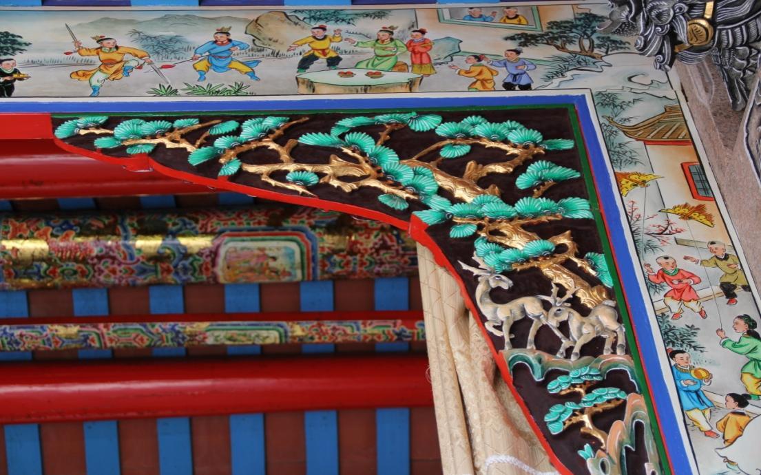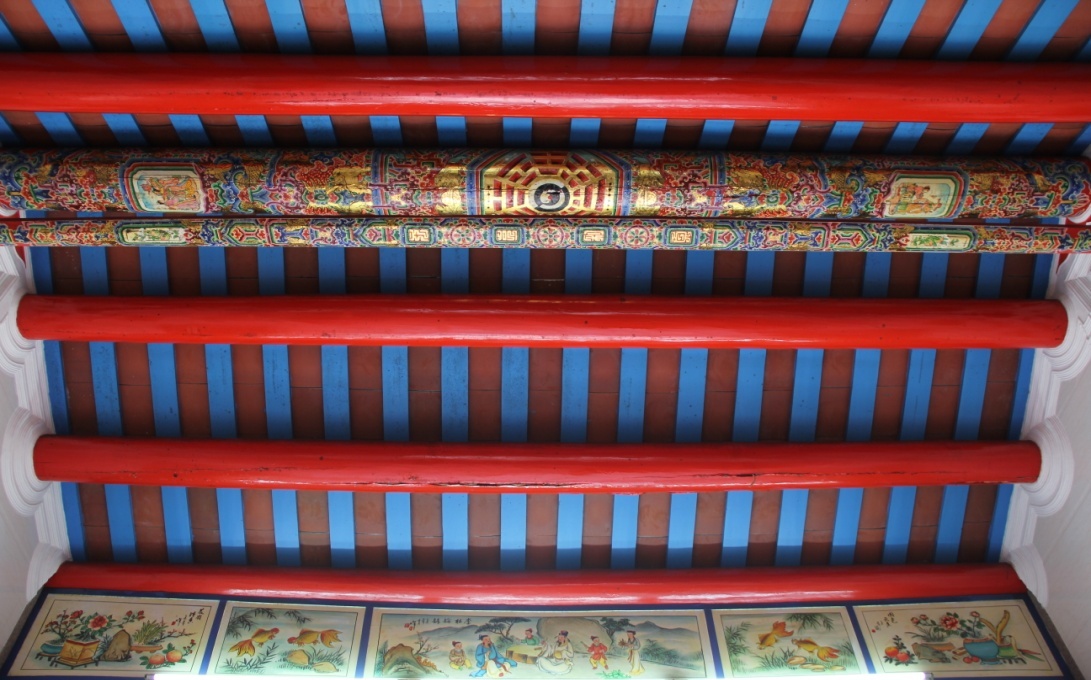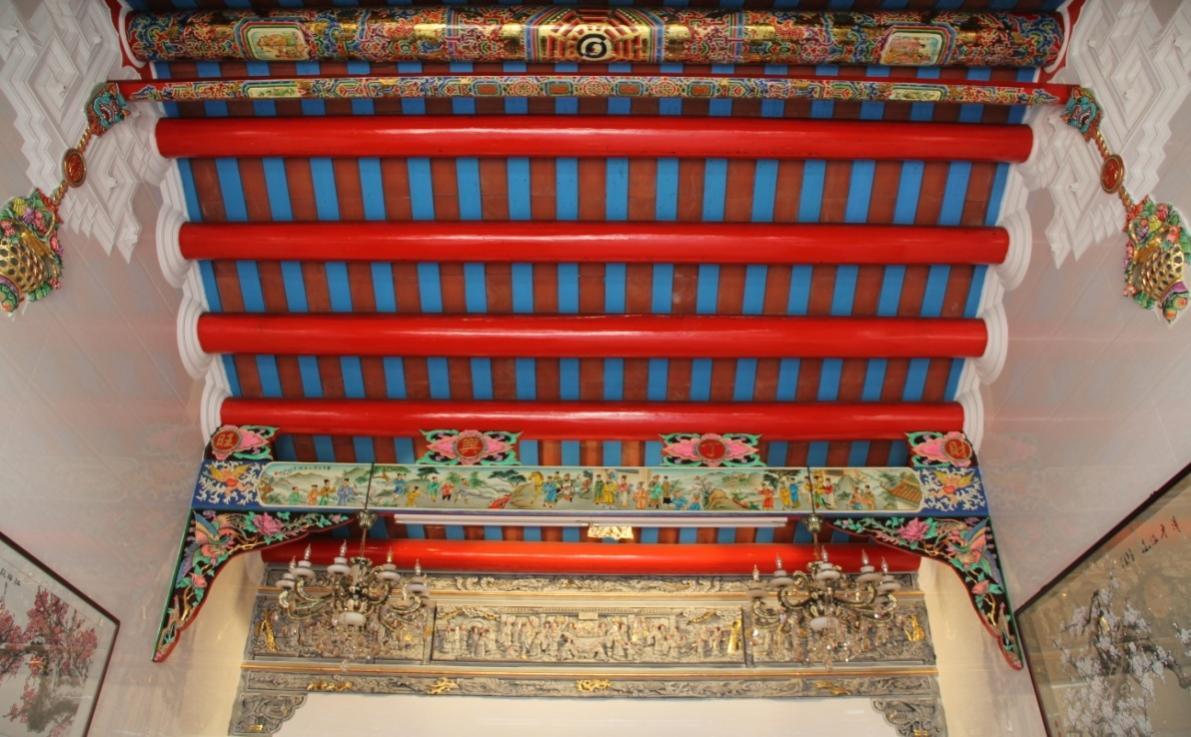 在他看来,画楹梁是最考验彩绘手艺的工作,也是最能彰显彩绘特色之处。“画楹梁的色泽非常繁多、相互交错,最重要的是,主梁的正中间要画伏羲八卦图,而八卦图的中心红点必须要按整座厝的分金字向来决定,这是很讲究的。”