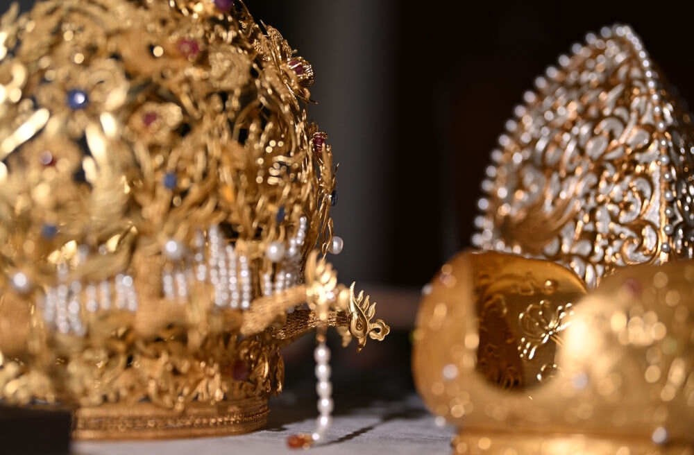 这是3月23日在天津市武清区博物馆拍摄的花丝镶嵌展览品。新华社记者 孙凡越摄