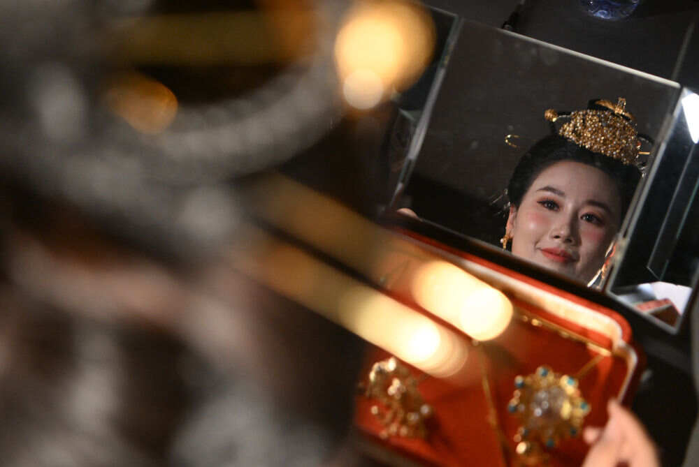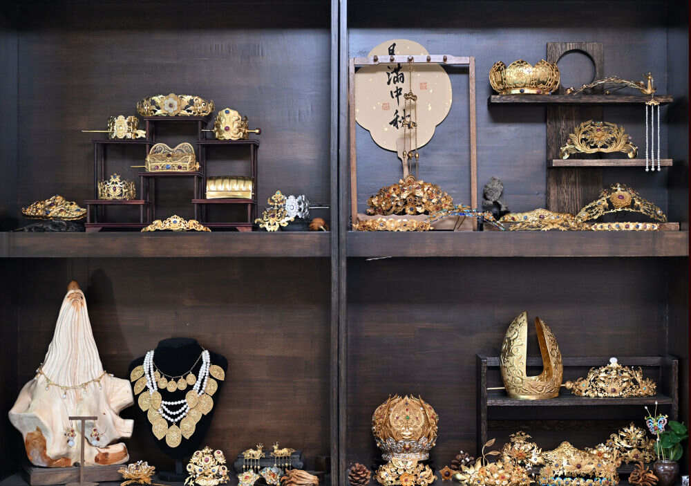 一名汉服爱好者在工作室内试戴花丝镶嵌技艺制作的头饰(3月7日摄)。新华社记者 孙凡越 摄