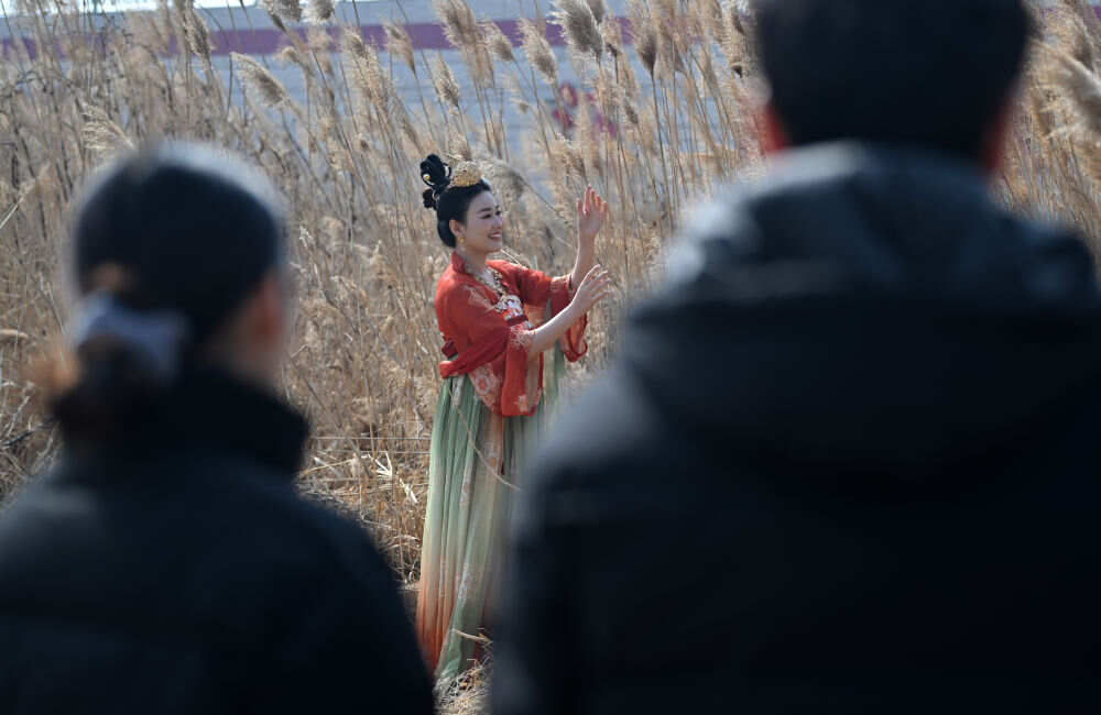 一位汉服爱好者在马赛(右)和女朋友闵方苹(左)的陪伴下拍照(3月7日摄)。新华社记者 李然 摄