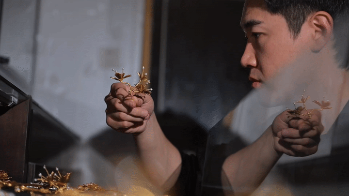 这是在天津市武清区崔黄口镇幌刘庄村的工作室拍摄的马赛制作的花丝镶嵌作品(4月25日摄)。新华社记者 赵子硕 摄